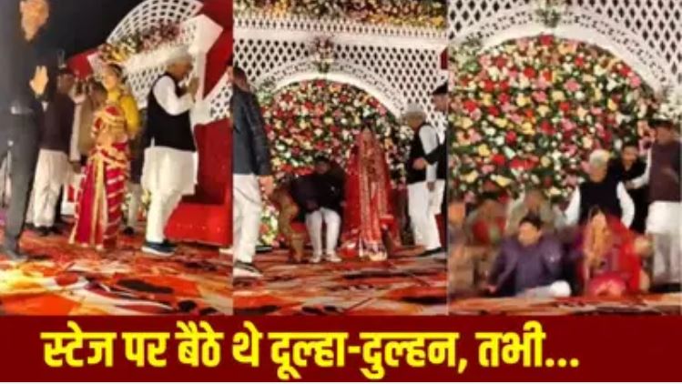 सभी एक साथ वर-वधु को आशीर्वाद देने के लिए स्टेज पर चढ़ गए। वजन ज्यादा होने से स्टेज टूट गया। वर-वधु समेत सभी लोग स्टेज से नीचे गिर गए। हालांकि किसी को गंभीर चोट नहीं आई। दूल्हा-दुल्हन भी सुरक्षित हैं। घटना बुधवार की है। वीडियो गुरुवार को सामने आया।